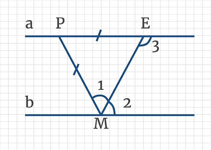 на рисунке изображены секущие МР и МЕ к параллельным прямым а и b . Установите соответствие между угламт и их градусными мерами, если угол 3 = 110°, а угол 1 = углу 2 и РМ=РЕ