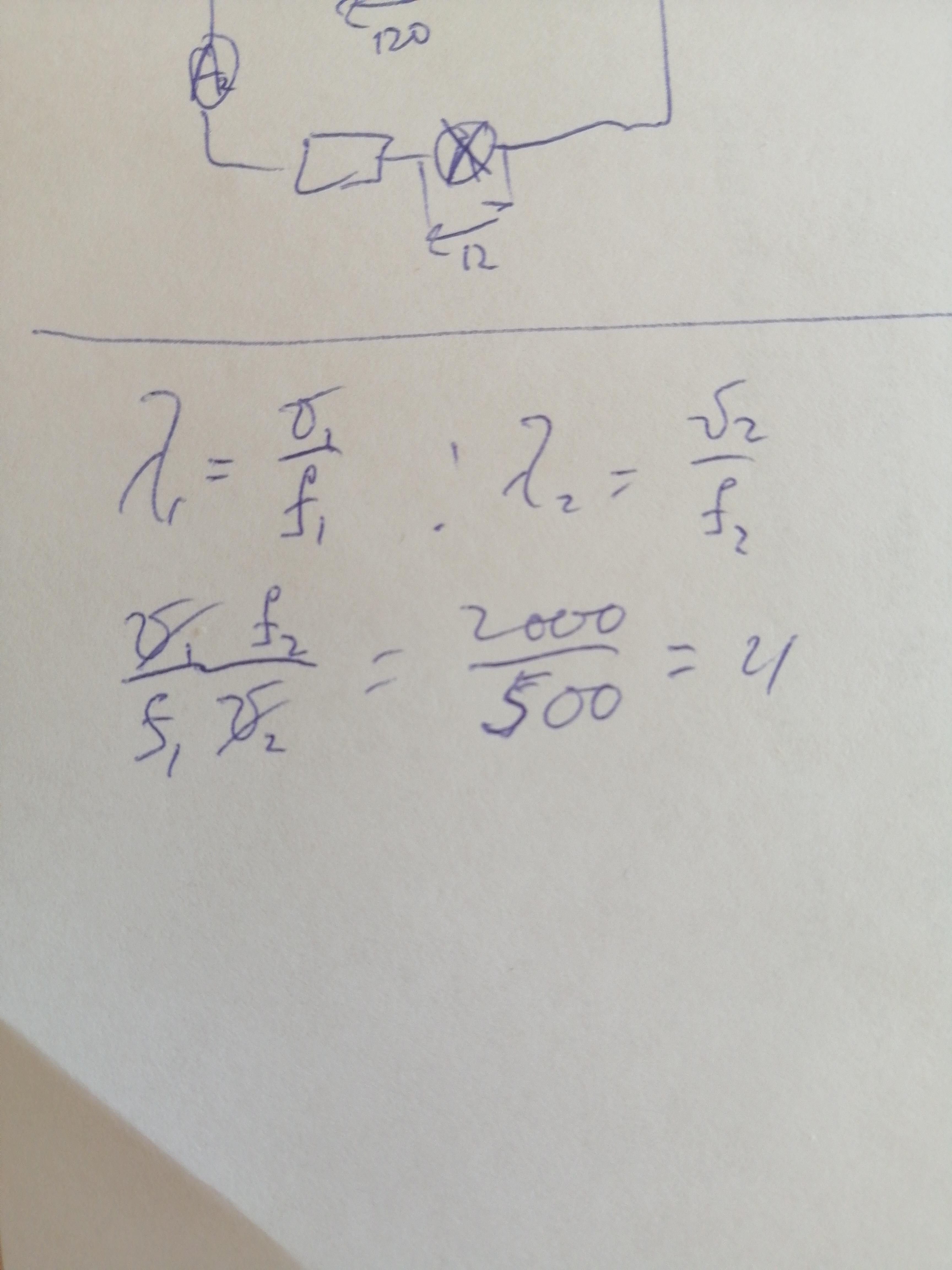 Частоты двух звуковых волн 500. Гц и 2000 Гц. Если их скорости в данной среде одинаковы, то отношение их длин λ1/λ2 — равно