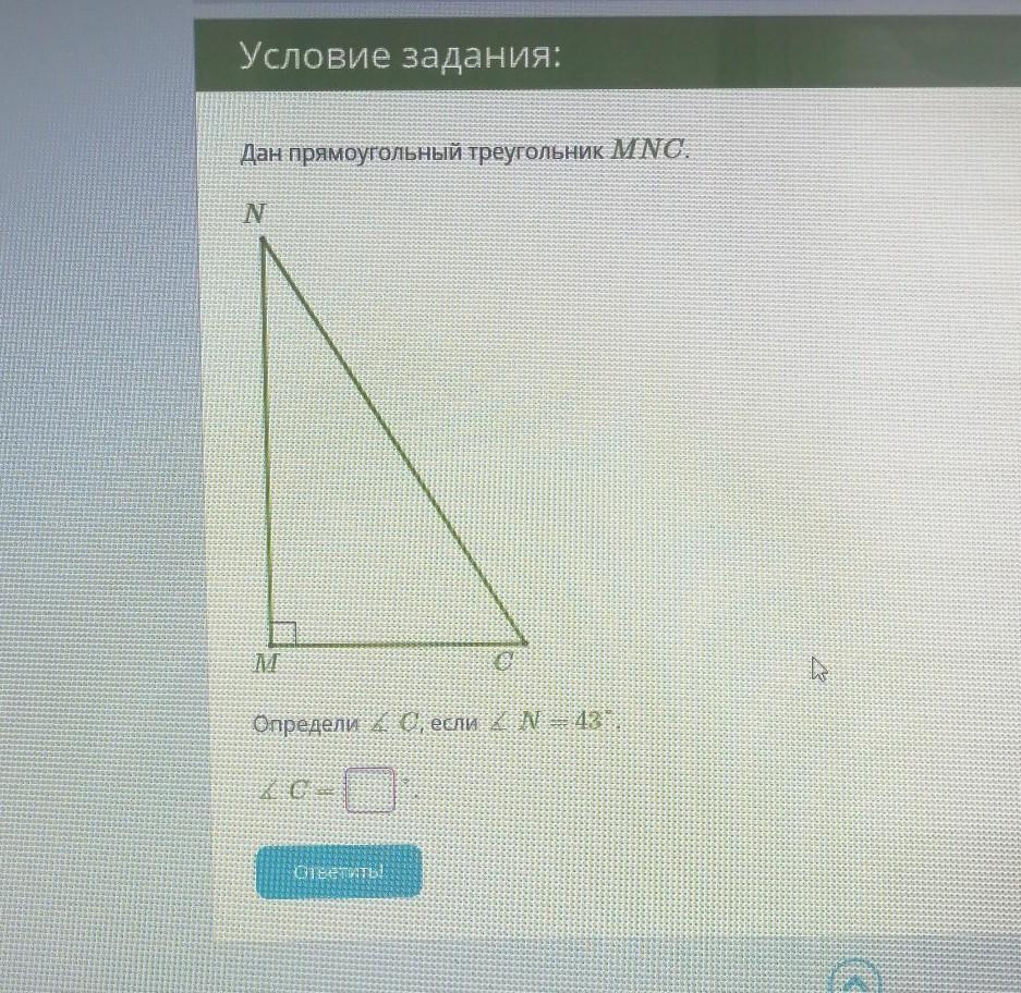 Почему все такие глупенькие это просто смотри угол M равен 90 градусов т.к. он прямой а угол N = 43 сумма углов в любом треугольнике ровна 180 градусов значит 90+43=133 из этого следует 180-133=4