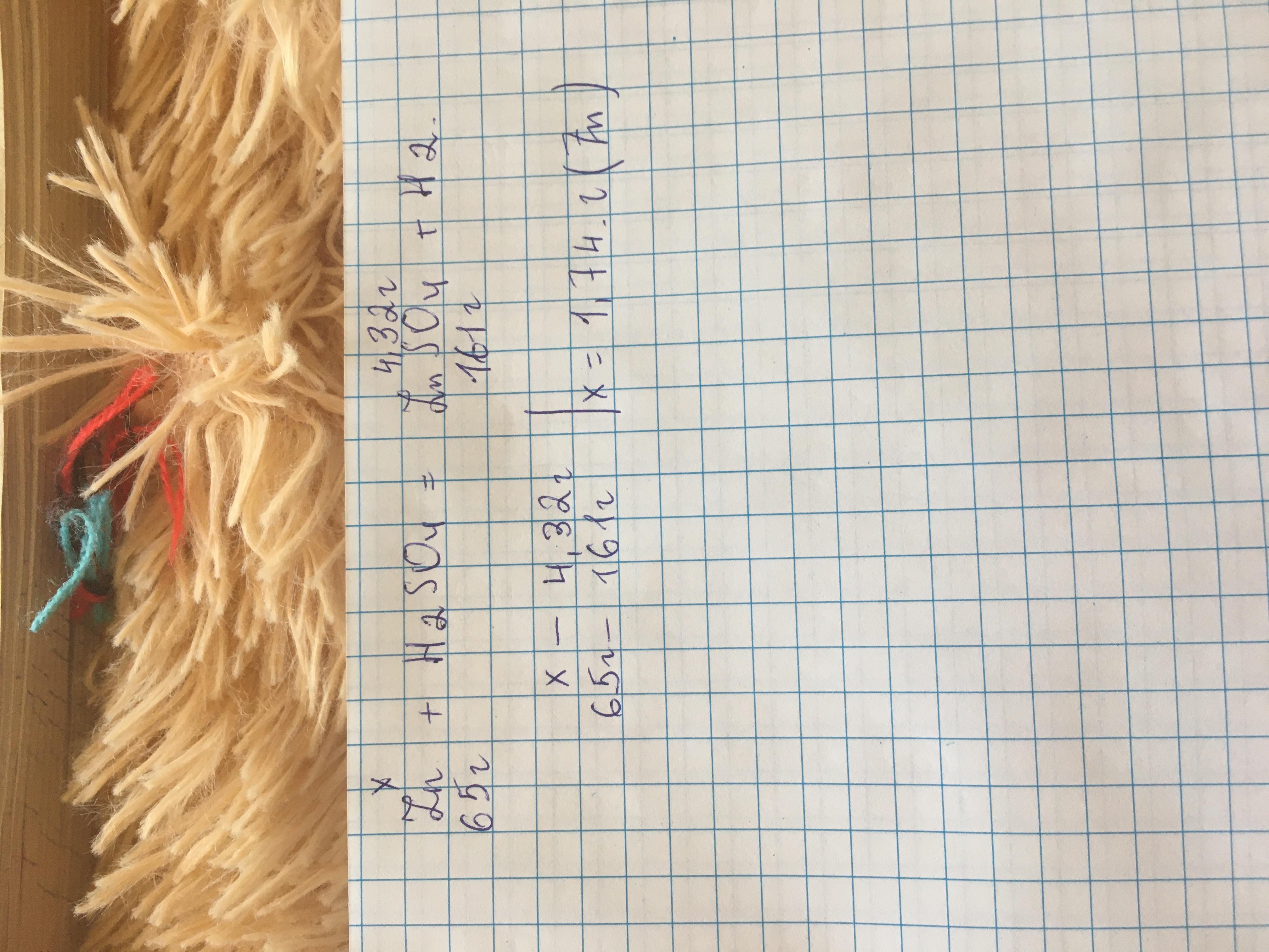 В реакции цинка с серной кислотой образовалось 4,32г сульфата цинка. Определите массу цинка, вступившего в реакцию.