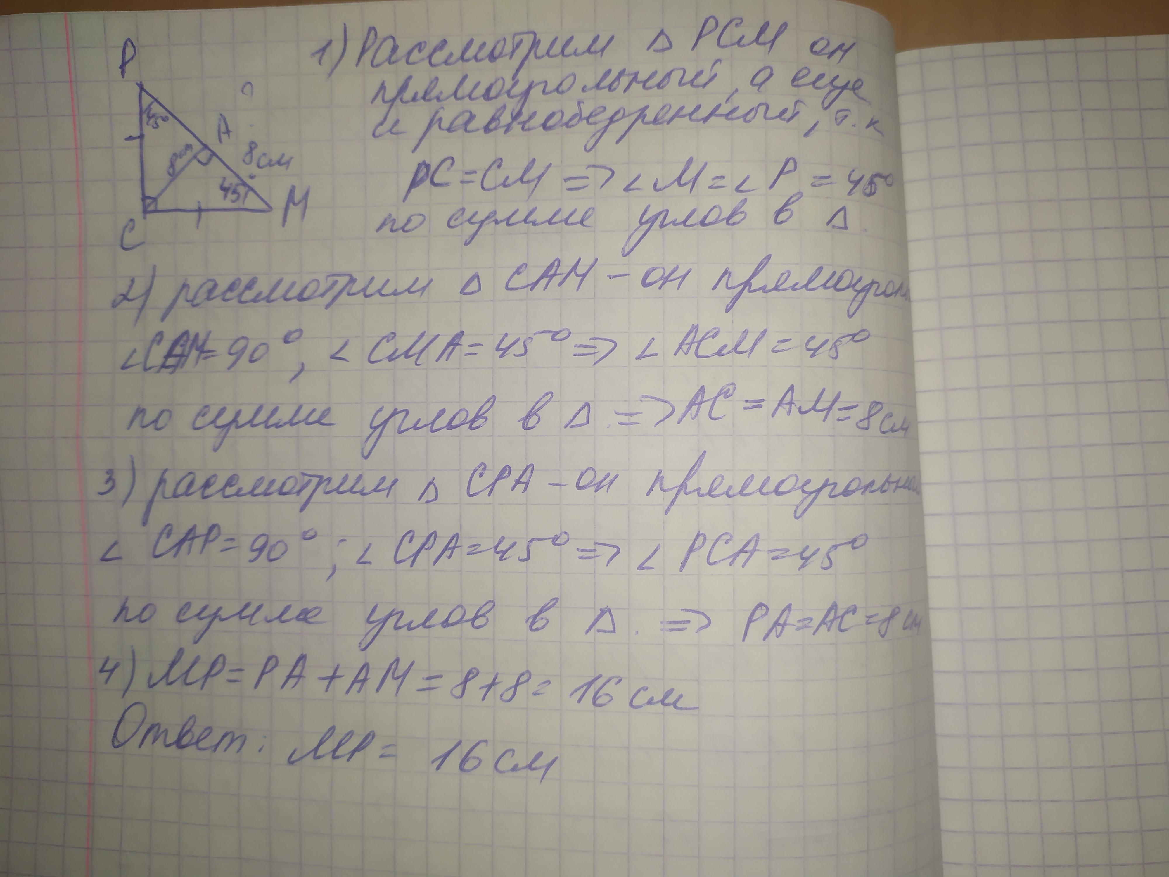 Т.к. треугольник равнобедренный, то СА- не только высота, но и медиана, а медиана, проведенная из вершины прямого угла к гипотенузе треугольника, равна половине гипотенузы, значит, РМ=8*2=16/см/