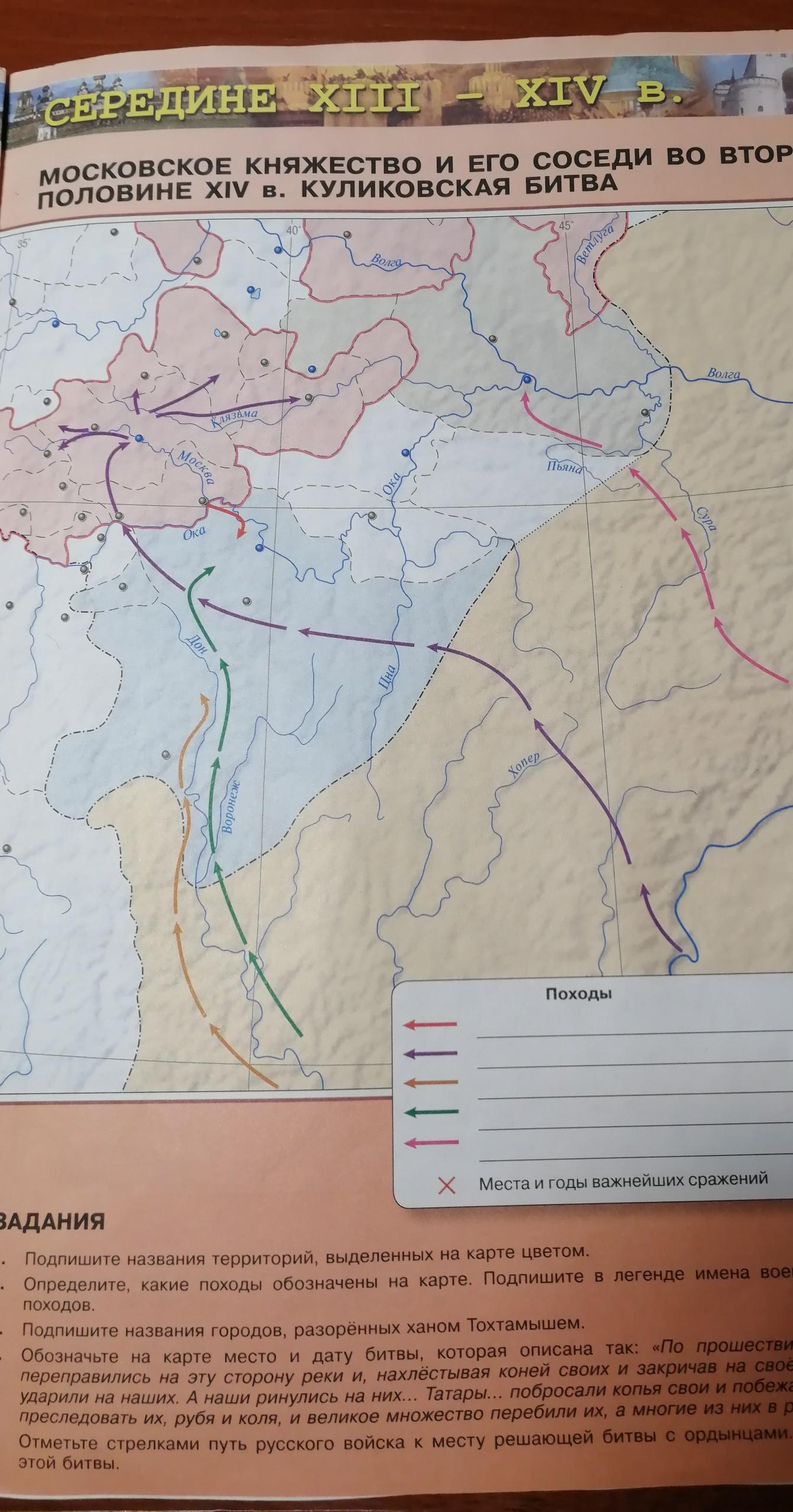 1) Подпишите названия территорий, выделенных на карте цветов. 2) Определите, какие походы обозначены на карте. Подпишите в легенде имена военачальников и даты этих походов. 3) Подпишите названия городов, разорённых ханом Тохтамышем. 4) Обозначьте на карте место и дату битвы, которая описана так: <<По прошествии немногих дней татары переправились на эту сторону реки и, нахлёстывая коней своих и закричав на своём языке, пошли рысью, и ударили на наших. А наши ринулись на них... Татары... побросали копья свои и побежали за реку... а наши стали преследовать их, рубя и коля, и великое множество перебили их, а многие из них в реке утонул>>. 5) Отметьте стрелками путь русского войска к месту решающей битвы с ордынцами. Обозначьте место и дату этой битвы.