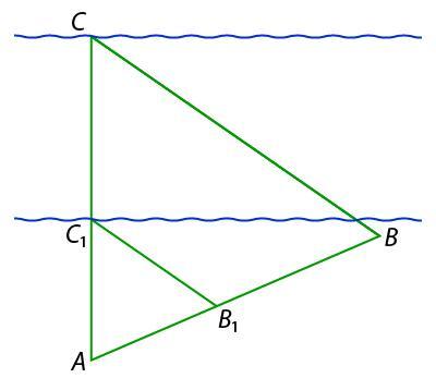 Известно, что отрезки ВС и В1С1 параллельны. Используя подобие треугольников ABC и A1B1C1, найдите ширину реки (отрезок СС1), если АС1 = 21 м, АВ1 = 35 м, ВВ1 = 45 м. Ответ дайте в метрах. СРОЧНО