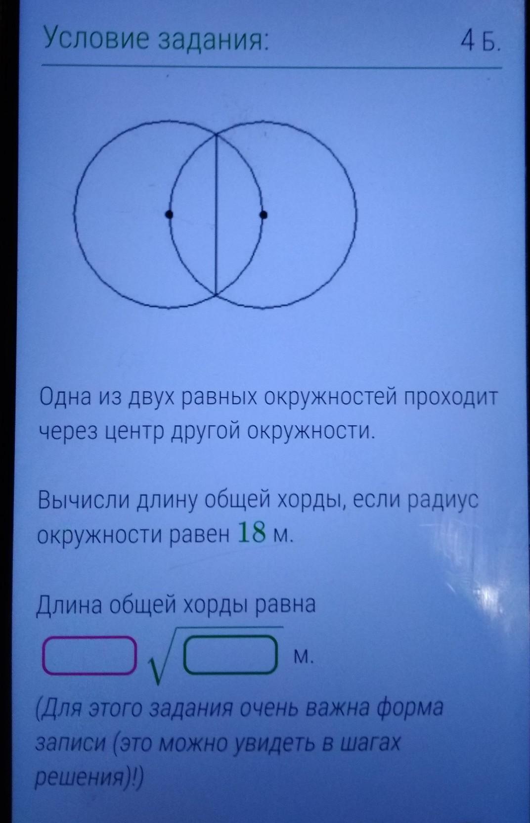 одна из двух равных окружностей проходит через центр другой окружности Вычисли длину общей хорды если радиус окружности равен 18 длина общей хорды равна