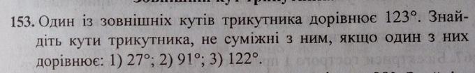 ПОМОГИТЕ ПОЖАЛУЙСТА СРОЧНО! Один із зовнішніх кутів трикутника дорівнює 123 градуси. Знайдіть кути трикутника, не суміжні з ним, якщо один з них дорівнює: 1) 27 градусів; 2) 91 градус; 3) 122 градуси.