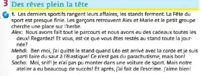 Спортивні дермері відкладають свої речі, трибуни близько. Фестиваль спорту майже закінчився. Хлопці знаходять Алекса і Марі, і невелика група шукає місця на траві. Олексій: Ми пройшли всю дорогу, і ми обоє отримали подарунки! Подивіться! А ти, ти цілий день залишався на стенді? Мехді: Ну, я пішов з місця, коли Лев приїхав із мотузкою, і я пішов з банджі, стрибаючи! Це не парашутно, але добре! Сачо: Мене, нюхай! Я не міг потрапити у спортивний автомобіль, але наш семінар був дуже успішним! А потім я робив фехтування. Мені це подобається!