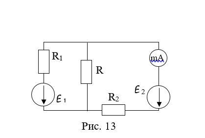 Какую силу тока показывает миллиамперметр в схеме, приведенной на рис. 13, если E1 = 2,4 В; E2 = 4,5 В; R2 = 1,5 кОм; R =0,50 кОм, падение напряже-ния на сопротивлении R1 равно 1,2 В? Внутренним сопротивлением элементов пренебречь. Найти мощность, выделяющуюся на сопротивлении R2.