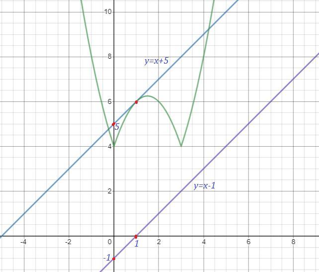 Из чертежа видно, что касательная к первому графику , параллельная у=х-1, будет единственная. Точка касания попадёт в промежуток (0,3) .