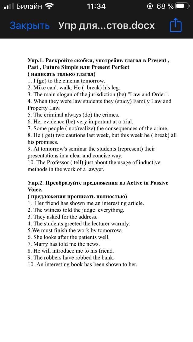 1. I (go) to the cinema tomorrow. 2. Mike can't walk. He ( break) his leg. 3. The main slogan of the jurisdiction (be) "Law and Order". 4. When they were law students they (study) Family Law and Property Law. 5. The criminal always (do) the crimes. 6. Her evidence (be) very important at a trial. 7. Some people ( not/realize) the consequences of the crime. 8. He ( get) two cautions last week, but this week he ( break) all his promises. 9. At tomorrow's seminar the students (represent) their presentations in a clear and concise way. 10. The Professor ( tell) just about the usage of inductive methods in the work of a lawyer.