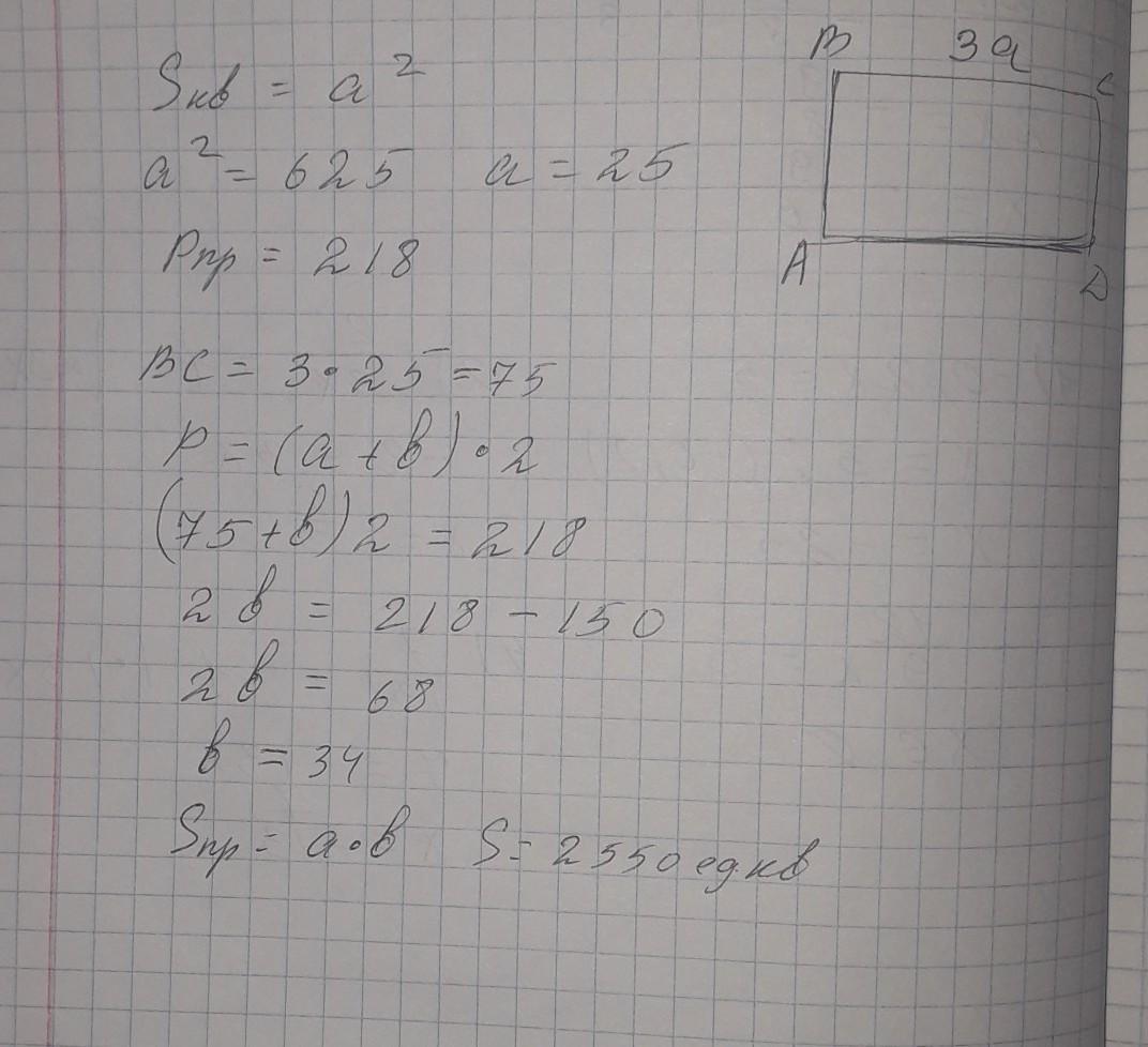 Площадь квадрата 625. Известно что одна из сторон прямоугольника в три раза больше стороны квадрата, его периметр равен 218. Найди площадь прямоугольника