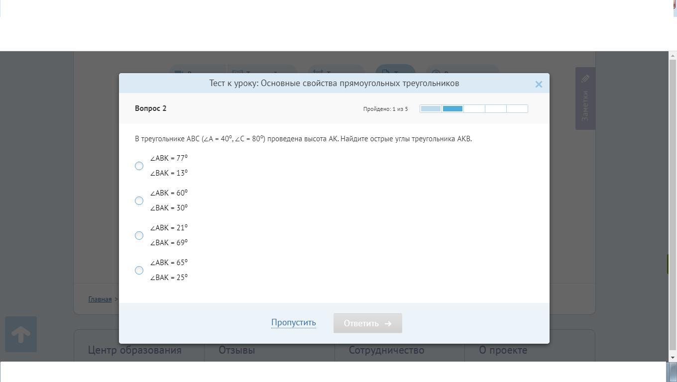 В треугольнике АВС (∠А = 40 градусов, ∠С = 80 градусов) проведена высота АК. Найдите острые углы треугольника АКВ.
