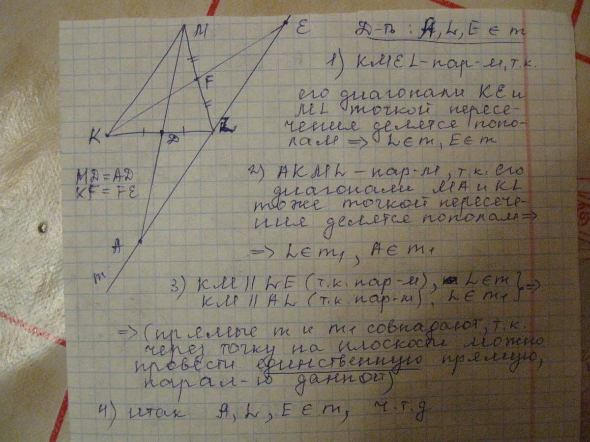 На продолжение медианы МД треугольникКЛМ отложен отрезок ДА=МД,а на продолжении медианы КФ отложен отрезок ФЕ=КФ .Докажите,что точки А,Л,Е лежат на одной прямой