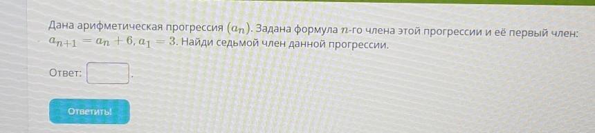 an+1 = an +6, а1 = 3. Найди седьмой член данной прогрессии.