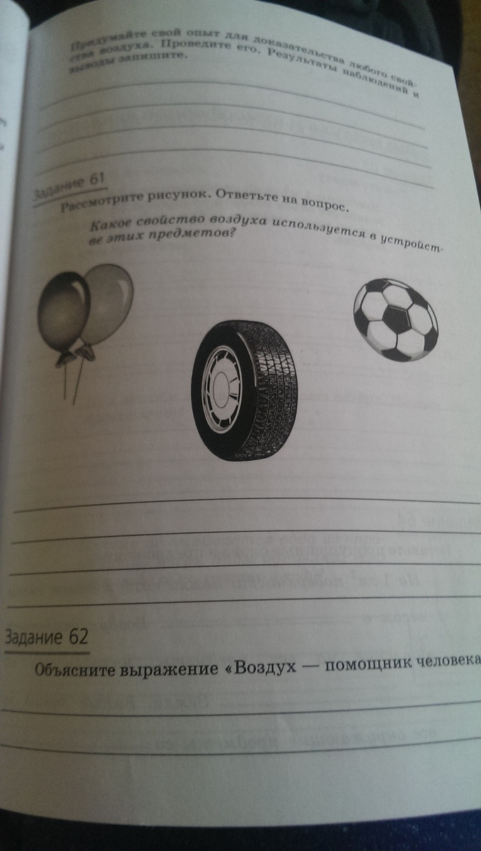 60. Упругость, сжимаемость. Занимает пространство данное ему. 61. В мяче шариках и шинах используется свойство воздуха: сжимаемость.