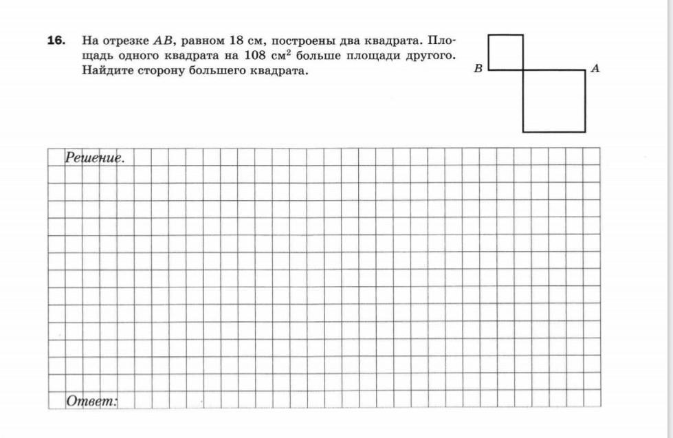на отрезке AB, равном 18 см, построены 2 квадрата. площадь одного квадрата на 108 см больше площади другого. найдите сторону большого квадрата.