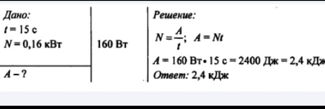 Человек, поднимающий ведро воды из колодца за 15 сек, развивает мощность 0,16 кВт. Какую работу он при этом совершает