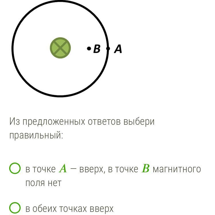 Для прямого проводника с током, изображённого на рисунке, определи направление линий магнитного поля в точках и .
