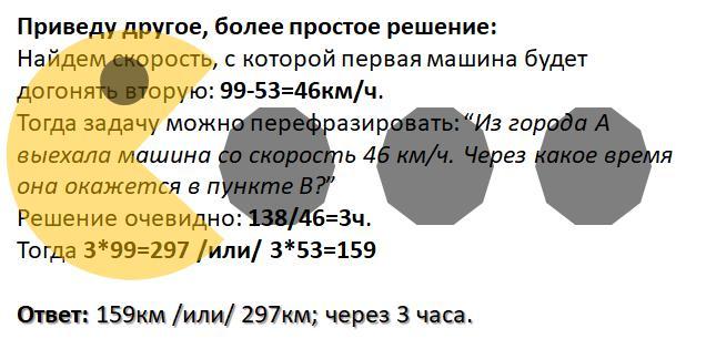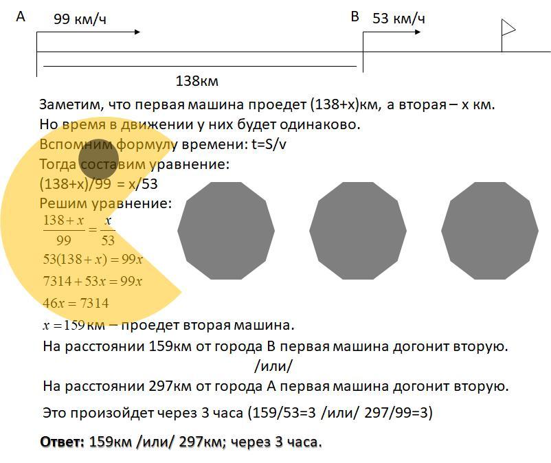 Скорость первой машины равна 99 км/ч, а скорость второй машины — 53 км/ч. На каком расстоянии от города первая машина догонит вторую и через какое время?