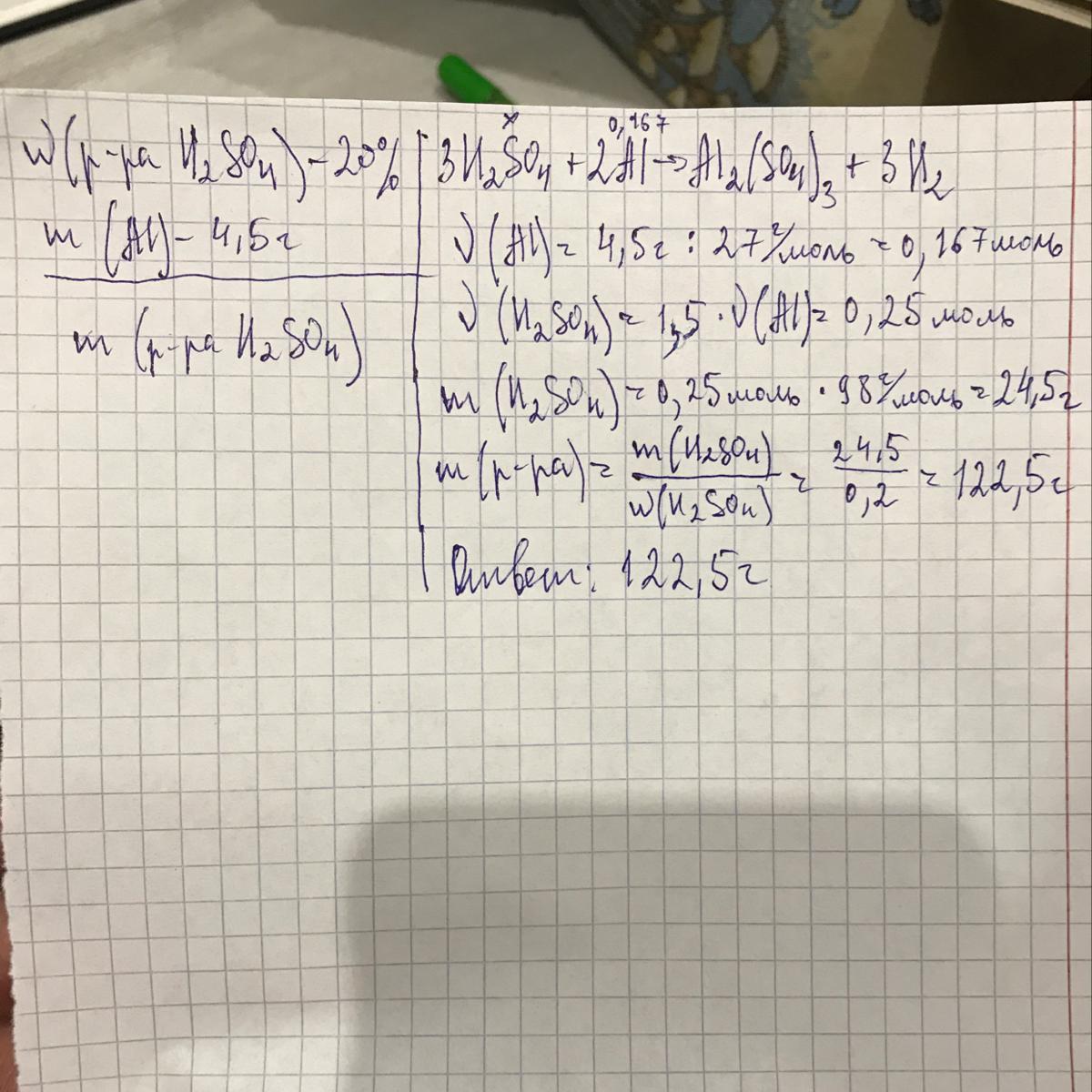 m(раствора)=m(H2SO4)÷ω(H2SO4)=24,5 / 0,2=122,5г