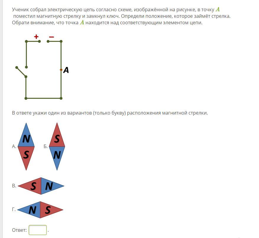 В ответе укажи один из вариантов (только букву) расположения магнитной стрелки.