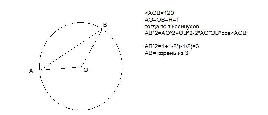 AB^2 = R^2 + R^2 - 2*R*R*cos AOB = 1 + 1 - 2*1*1*cos 2П/3 =