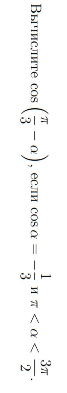 Вычислите cos ( frac{pi}{3} - a), если  cos( alpha ) = - frac{1}{3} и pi < a < frac{3pi}{2}