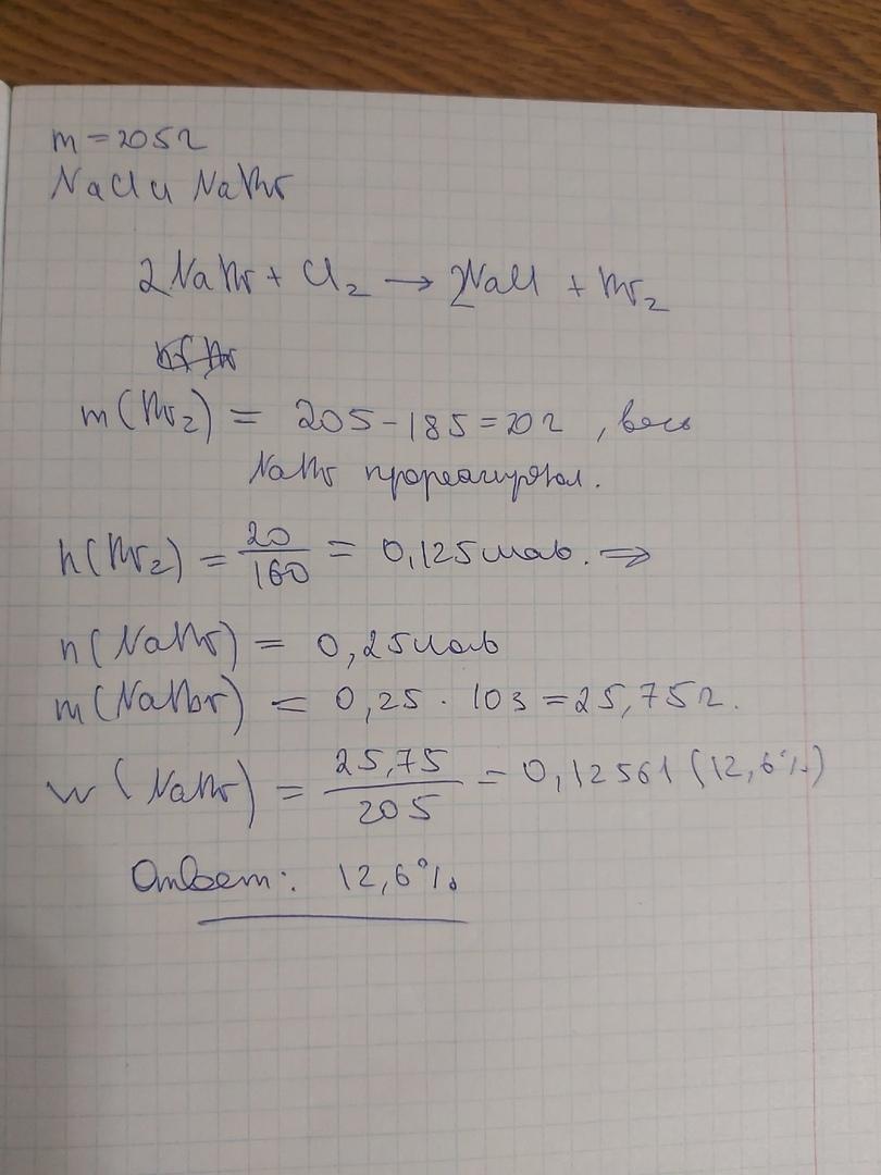 Масса раствора 205 г, содержит хлорид натрия и бромид натрия. Через него пропустили избыток хлора. В результате масса хлорида натрия составила 185 г. Вычислите массовую долю бромида натрия в исходной смеси.
