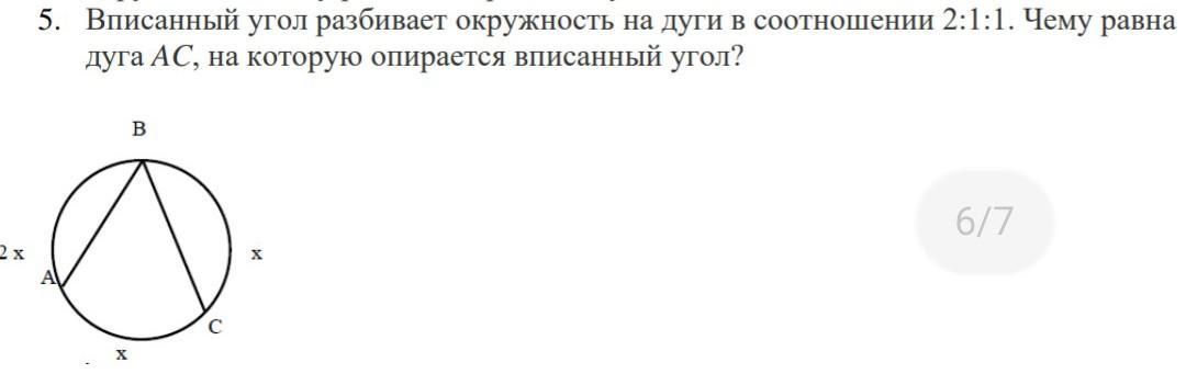 Вписанный угол разбивает окружность на дуги в соотношении 2:1:1. Чему равна