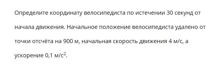 Определите координату велосипедиста по истечении 30 секунд от начала движения. Начальное положение велосипедиста удалено от точки отсчёта на 900 м, начальная скорость движения 4 м/с, а ускорение 0,1 м/с в квадрате.