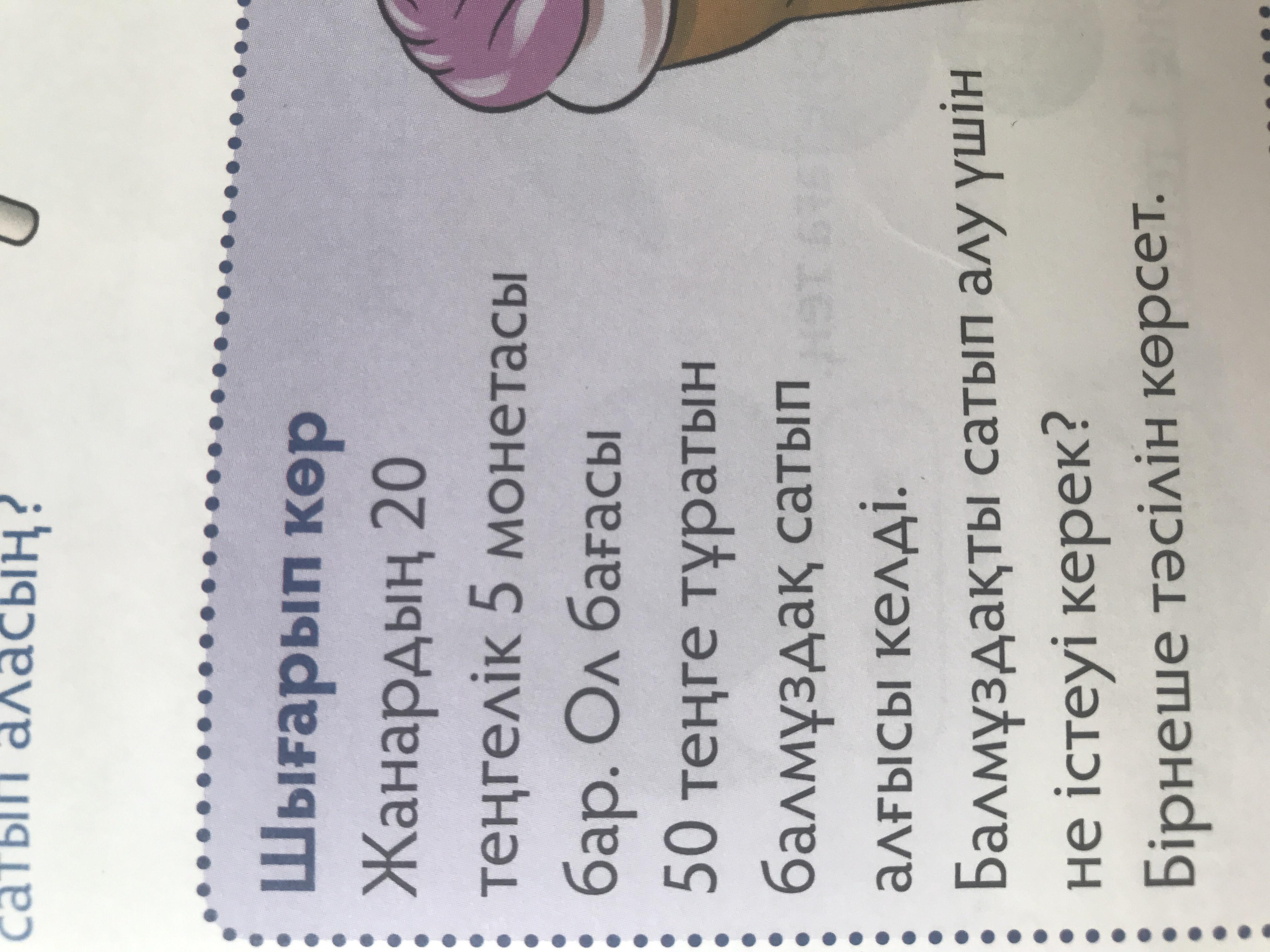 Жанардың 20 теңгелік 5 монетасы бар. Ол бағасы 50 теңге тұратын балмұздақ сатып алғысы келді. Балмұздақты сатып алу үшін не істеу керек? Бірнеше тәсілін көрсет