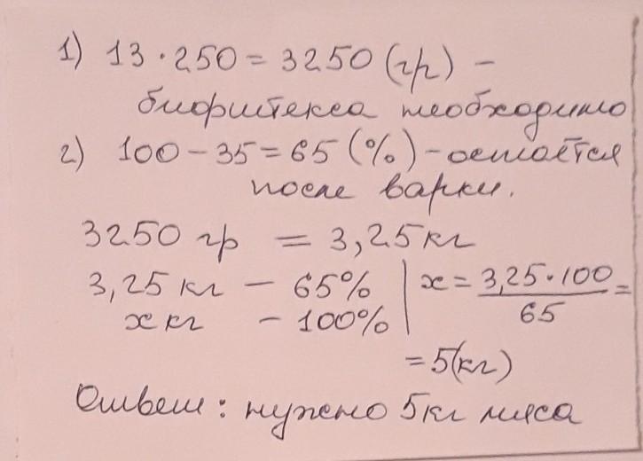 Повару необходимо приготовить 13 порции бифштекса по 250 гр в каждой. Сколько необходимо взять мяса, если известно, что мясо при варке теряет 35% своей массы?