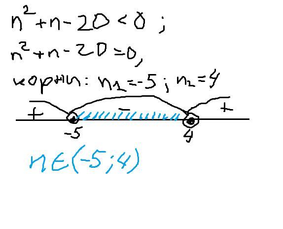 n²+n-20=0 Д=1²-4×1×(-20)=81 х1=-5, х2=4