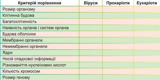 Заповніть порівняльну таблицю особливостей будови форм життя і вірусів