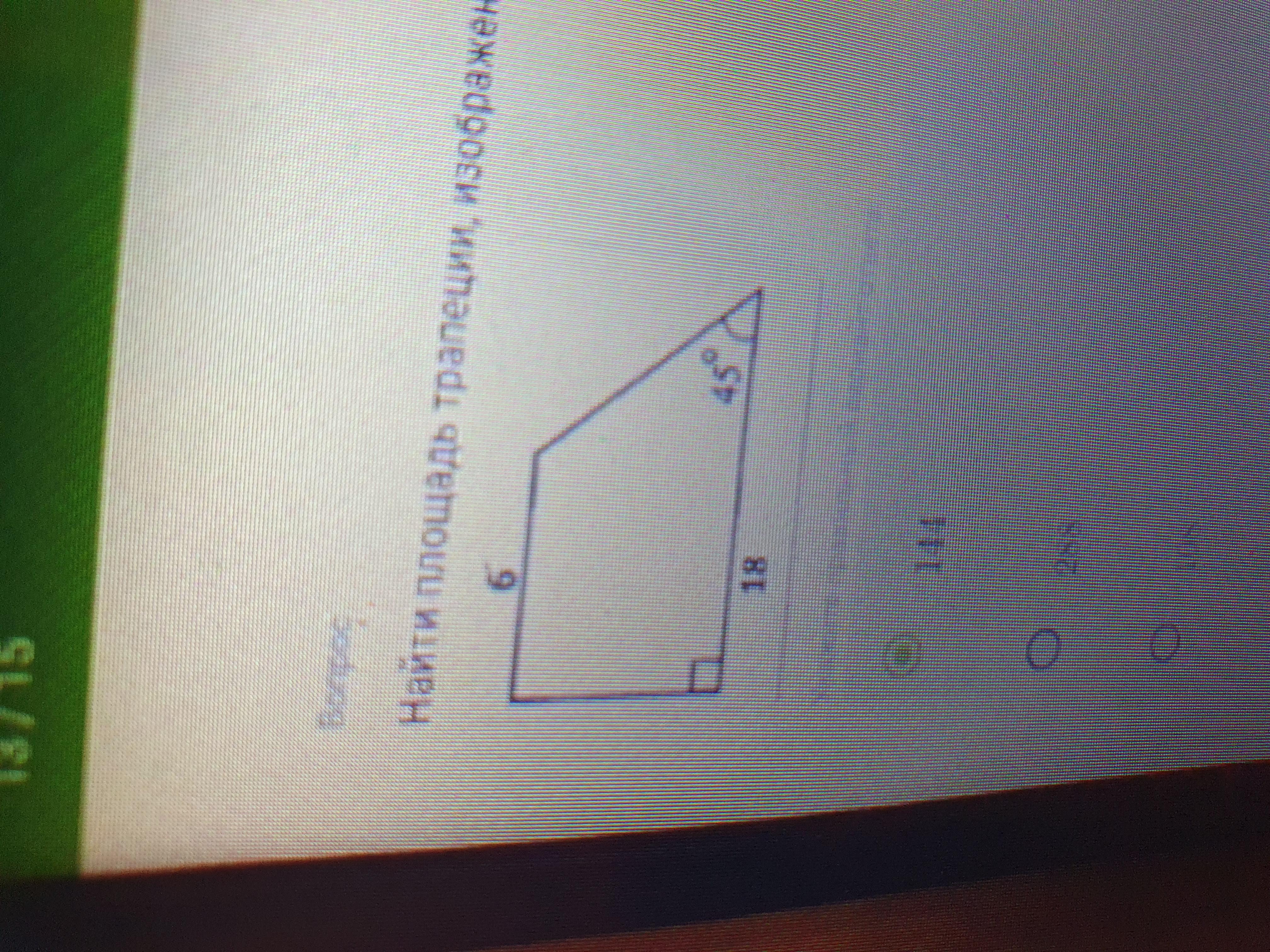 В прямоугольной трапеции меньшая сторона равна 6, большая 18, а острый угол(другой)равен 45° найдите площадь трапеции