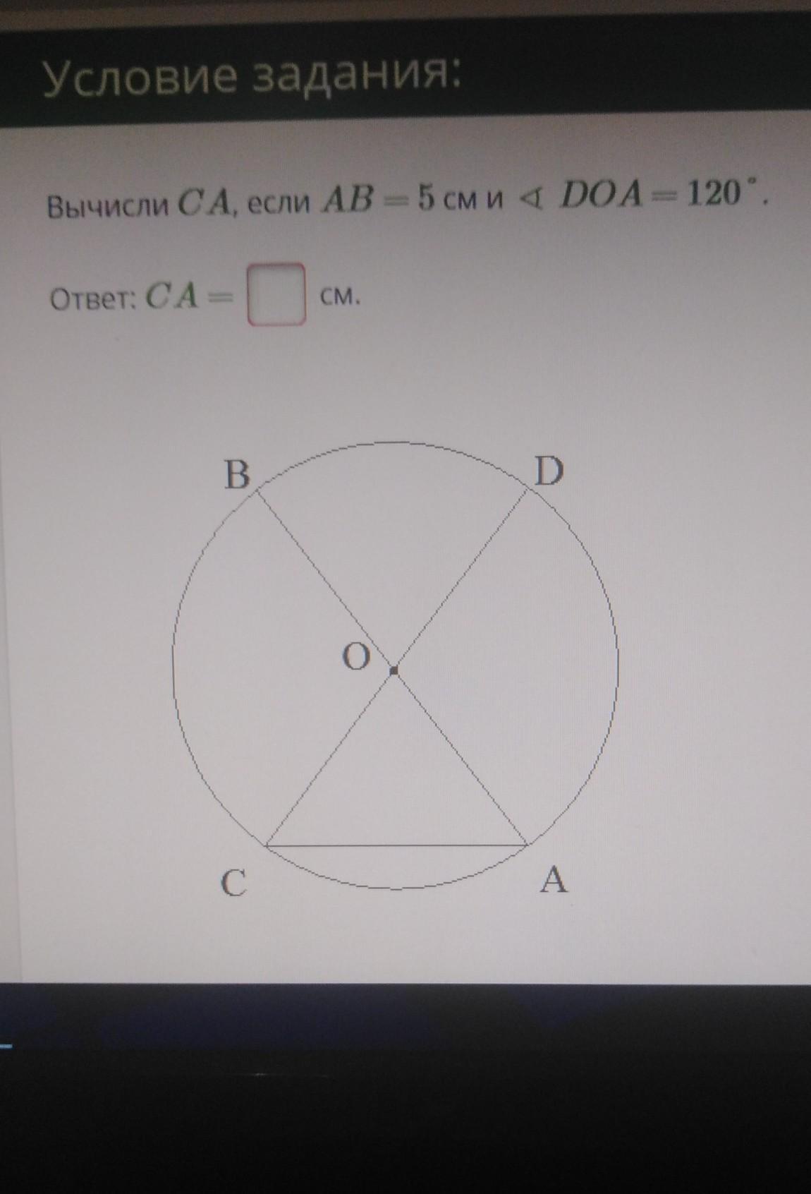 АВ это диаметр и равен он двум радиусом, значит радиус равен 5/2=2,5 см, тогда и СА=2,5 см