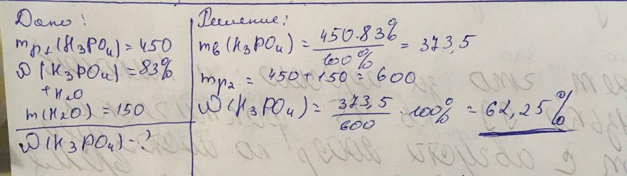 К 450 граммам 83%-ного раствора ортофосфорной кислоты добавили 150 граммов воды. Рассчитай массовую долю растворённого вещества в образовавшемся растворе.