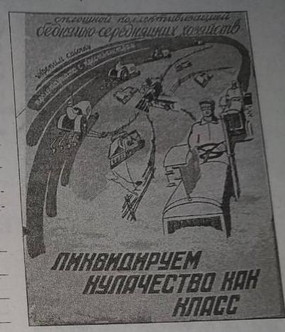 Напис на плакаті: «Суцільною колективізацією бідняцько-середняцьких господарств закріпимо злиття пролетаріату із селянством. Ліквідуемо куркульство як клас». Розгляньте плакат і дайте відповіді на запитання.