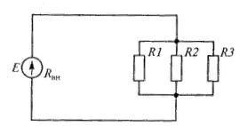 Чему равен ток I в данной цепи, если E = 16 В, Rвн = 2 Ом, R1 = 5 Ом, R2 = 4 Ом, R3 = 10 Ом?