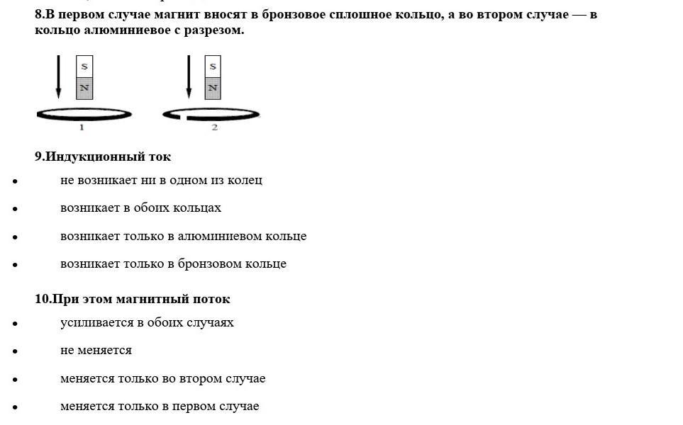 В первом случае магнит вносят в бронзовое сплошное кольцо, а во втором случае в кольцо алюминиевое с разрезом