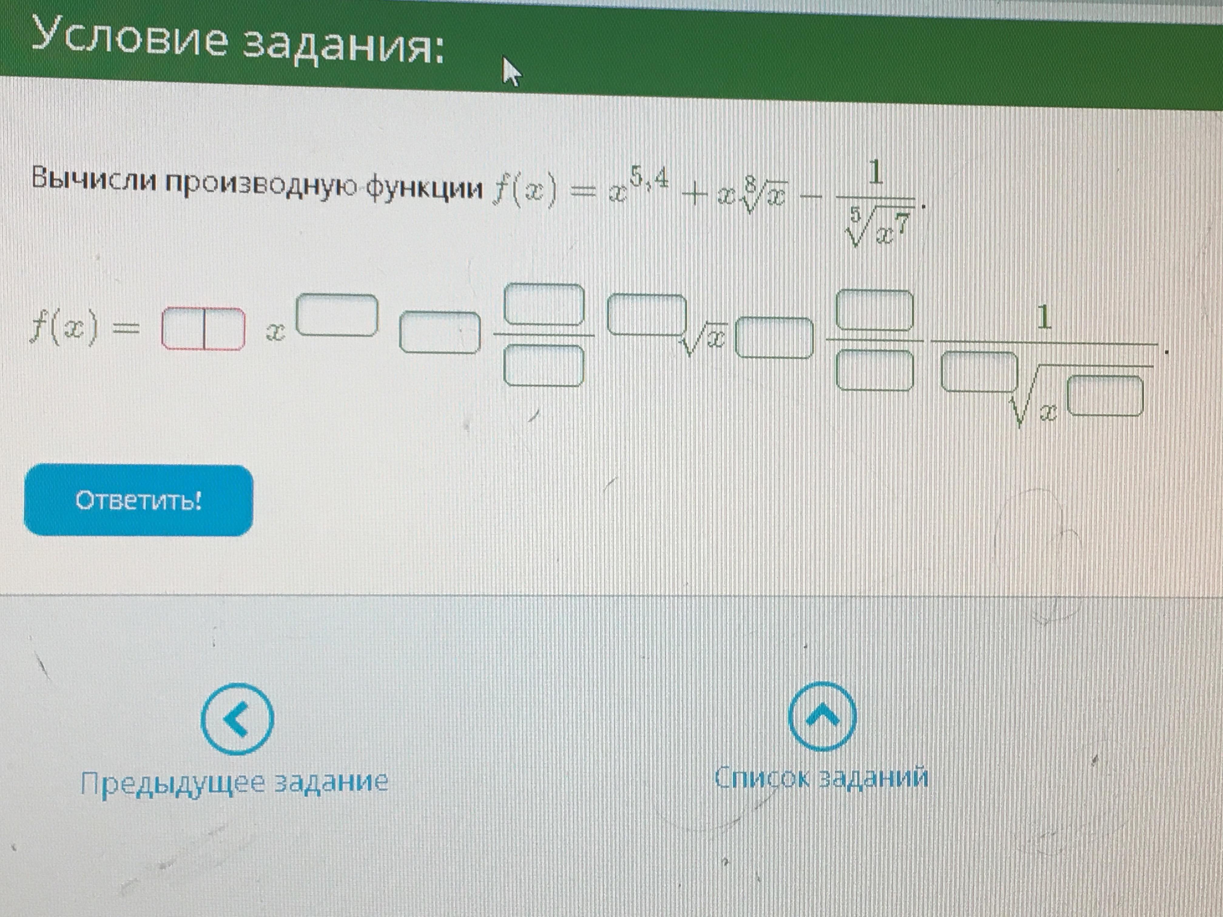 Объяснение:=5,4х⁴'⁴+9/8 · ⁸√x - 7/5 · 1 / ⁵√x¹²