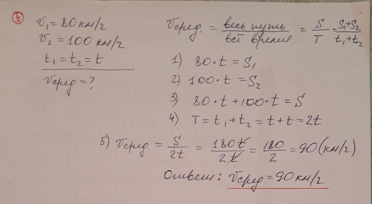 4. Автомобиль двигался половину времени со скоростью 80 км/ч, а вторую половину времени – со скоростью 100 км/ч. Найдите среднюю скорость автомобиля на всем пути. Ответ дайте в км/ч.