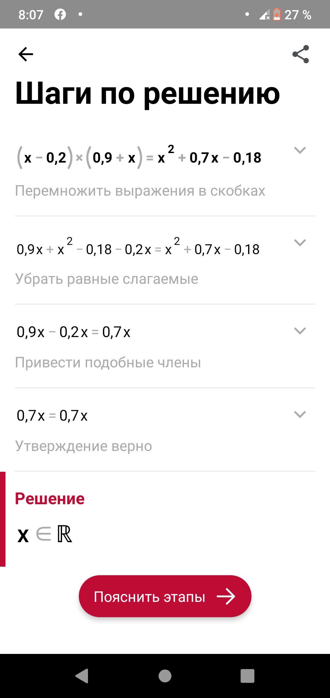 Левая часть равенства (x-0,2)•(0,9+x)=x²+0,7x-0,18 равна правой? Ок как после тождественных преобразований в левой части получится выражение