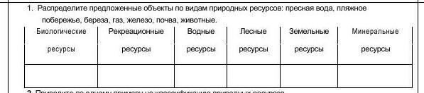 Распределите предложенные объекты по видам природных ресурсов:пресная вода, побережье,берёза,газ,железо, почва,животные.