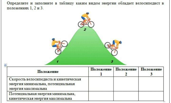 определите и заполните таблицу каким видом энергии обладает велосипедист в положениях 1, 2 и 3.