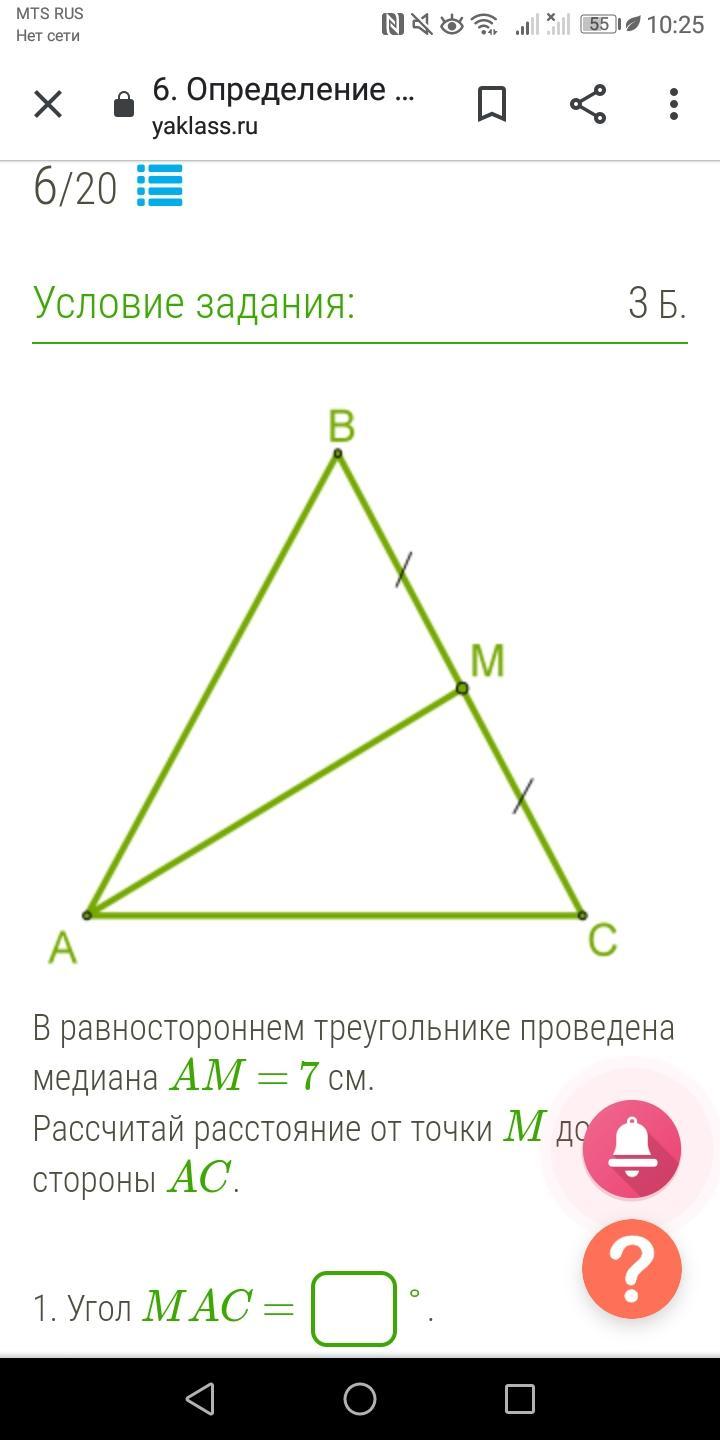 В равностороннем треугольнике проведена медиана AM = 7 см. Рассчитай расстояние от точки M до стороны AC. 1. Угол MAC = °.