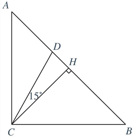 Найти углы прямоугольного треугольника, если угол между биссектрисой и высотой, проведёнными из вершины прямого угла, равен 15∘.
