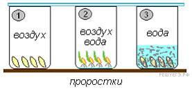 В изображенном на рисунке опыте экспериментатор взял три стакана и положили на дно каждого по нескольку зёрен пшеницы. В первый стакан воду не наливали. Во второй налили воды столько, чтобы она только смачивала семена, но не покрывала их полностью. Третий стакан наполнили до половины водой. Все три стакана накрыли стеклом и оставили в теплом помещении.