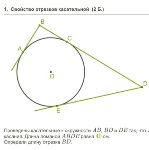 Проведены касательные к окружности AB,BD и DE так , что A,C -точки касания. Длина ломаной ABDE равна 40 см. Определи длинну отрезка BD