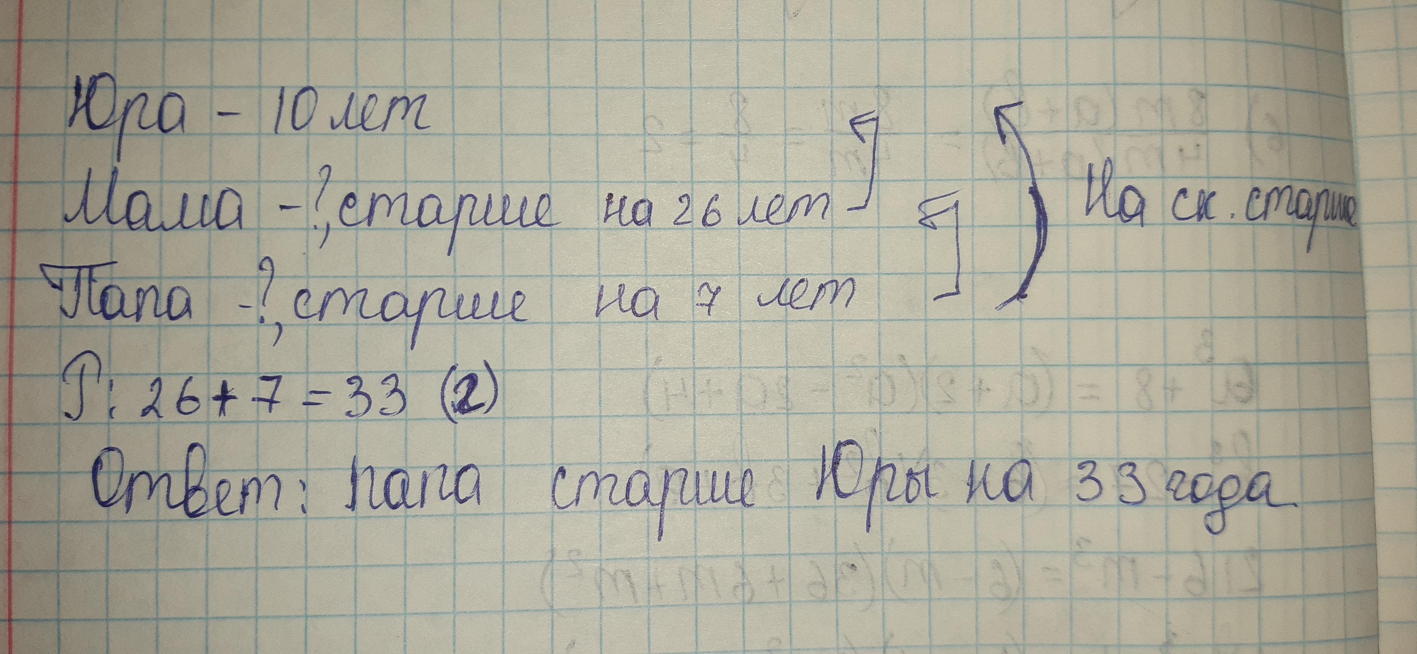 Юре 10 лет мама старше юры на 26 лет Папа старше мамы на 7 лет на сколько папа старше юры? реши задачу одним действием