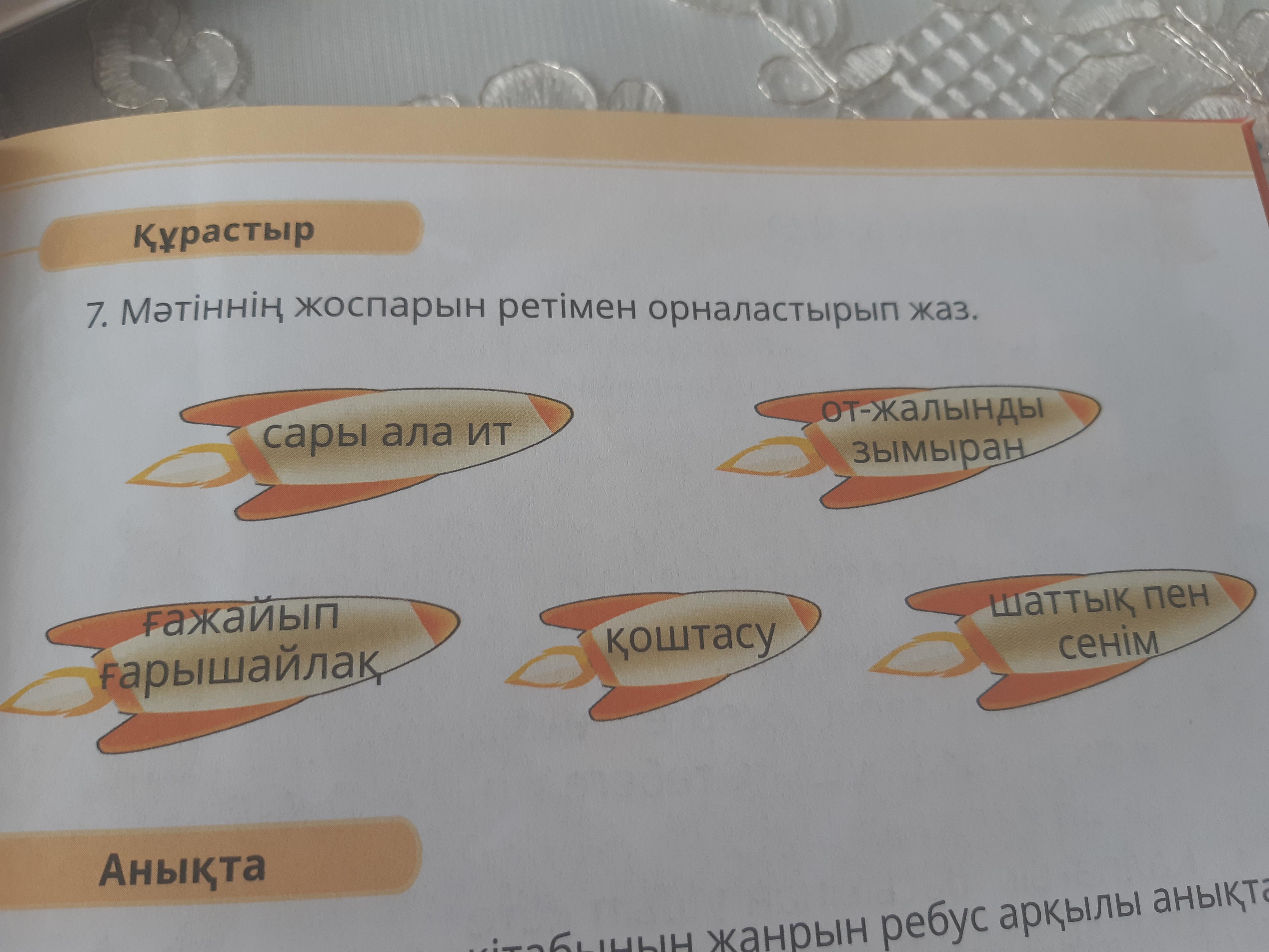 1)ғажайып ғарышайлақ 2)сары ала ит 3)қоштасу 4)от-жалынды зымыран 5)шаттық пен сенім